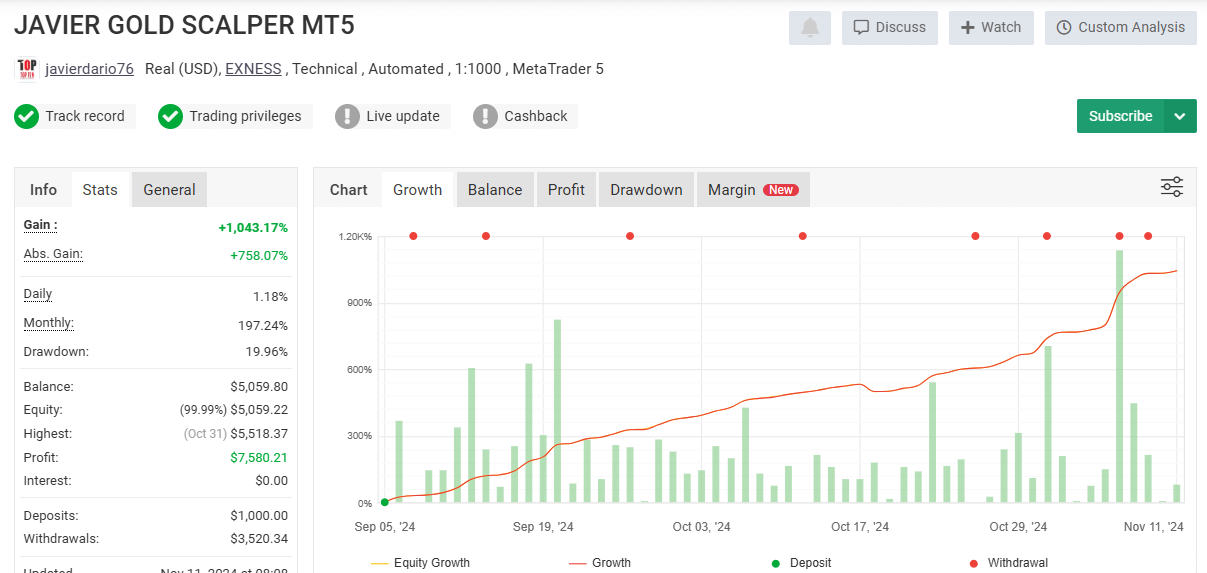 Automated Gold Scalping: The EA is engineered to exploit short-term price movements in the gold market, executing trades with speed and accuracy to harness frequent fluctuations.