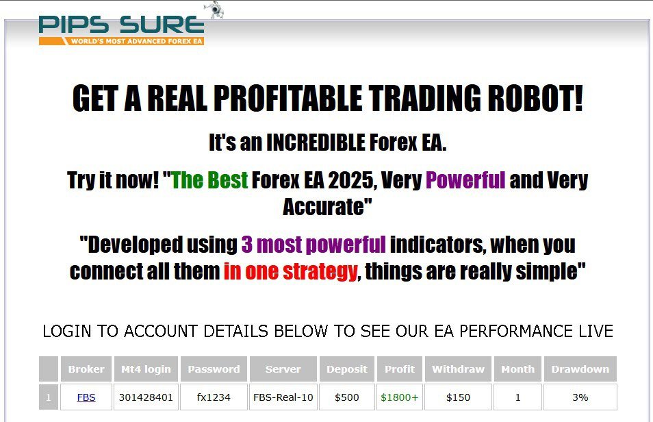 Pips Sure v2.1 is an advanced MT4 Expert Advisor that executes trades automatically based on predefined algorithms and market logic.